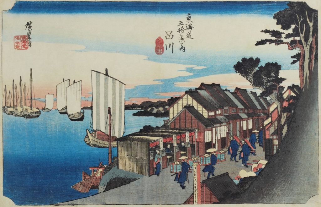 During the Edo period, the development of the domestic transportation network progressed under the orders of Tokugawa Ieyasu, and one of these routes was the Tōkaidō, considered the busiest route at the time. The Tōkaidō stretched approximately 500 km from Nihonbashi to Sanjō Ohashi in Kyoto, a journey that took about two weeks. Travelers then moved on foot or horseback, limiting daily distances, so post towns were established along the route. The term “Fifty-Three Stations” (Gojūsantsugi) comes from the 53 times travelers, horses, and goods were transferred from one post town to the next. The image above depicts Shinagawa-juku from “The Fifty-Three Stations of the Tōkaidō” by Utagawa Hiroshige, a renowned ukiyo-e artist representing the late Edo period. Hiroshige created ukiyo-e featuring landscapes, and his works depicting the famous sites, nature, and local specialties of the Tōkaidō remain today. These works are highly valued as historical materials for understanding the culture of that era.