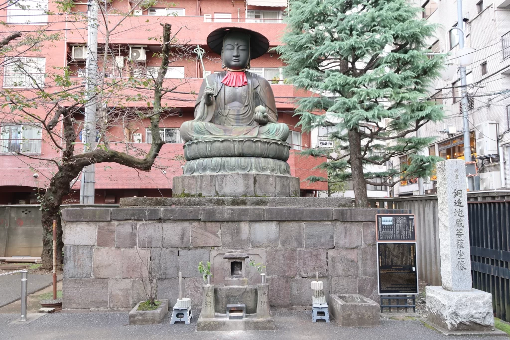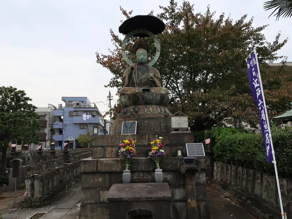The origin of the Edo Rokujizōson is as follows. Jizō Osho Shōgen, who resided in Fukagawa, Edo (present-day Kōtō Ward), fell ill with an incurable disease. After praying with his parents to Jizō Bosatsu for recovery, Shōgen was able to regain his health. Following the style of the Rokujizō in Kyoto, donations were collected through public appeal starting in 1706 (Enpō 4) to erect six Jizō statues. With these donations, statues of Jizo Bosatsu were erected at six locations throughout Edo. The names of the donors and the year of erection are inscribed on the torso and lotus pedestal of each statue. The statues were cast by the foundryman of Kanda-machi, Ota Suruga-no-kami Fujiwara no Shōkichi. During the early Meiji period’s anti-Buddhist movement, the Sixth Jizō Bosatsu at Fukagawa Eidaiji Temple was destroyed. A replacement statue now stands at the Tendai sect’s Jōmyōin Temple. The Kaichōzan Sen’enji Jizō is the oldest of the six statues, erected in 1708. It stands at an impressive 275 cm tall, the tallest of the existing statues, and was once gilded with gold leaf. Its exquisite craftsmanship, rare for a mid-Edo period bronze statue, led to its designation as a cultural property.