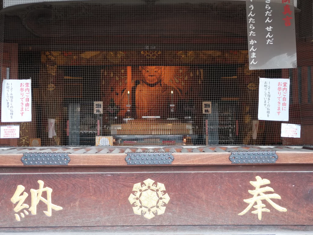 The main image bears the mantra of Fudō Myōō: “Nōmaku sanmanda bazara dan sendā makarōshada sowataya untarata kanman.” This is the phrase used to fulfill one’s wishes before Fudō Myōō. The outer walls of the main hall are covered in Sanskrit characters. Additionally, daily homa rituals are performed at fixed times; one was taking place when I visited. The sound of sutras and a large drum reached my ears. I could peek in from the side, and the sutras and drum echoing through the solemn atmosphere, along with the towering flames, gave me a mystical feeling.