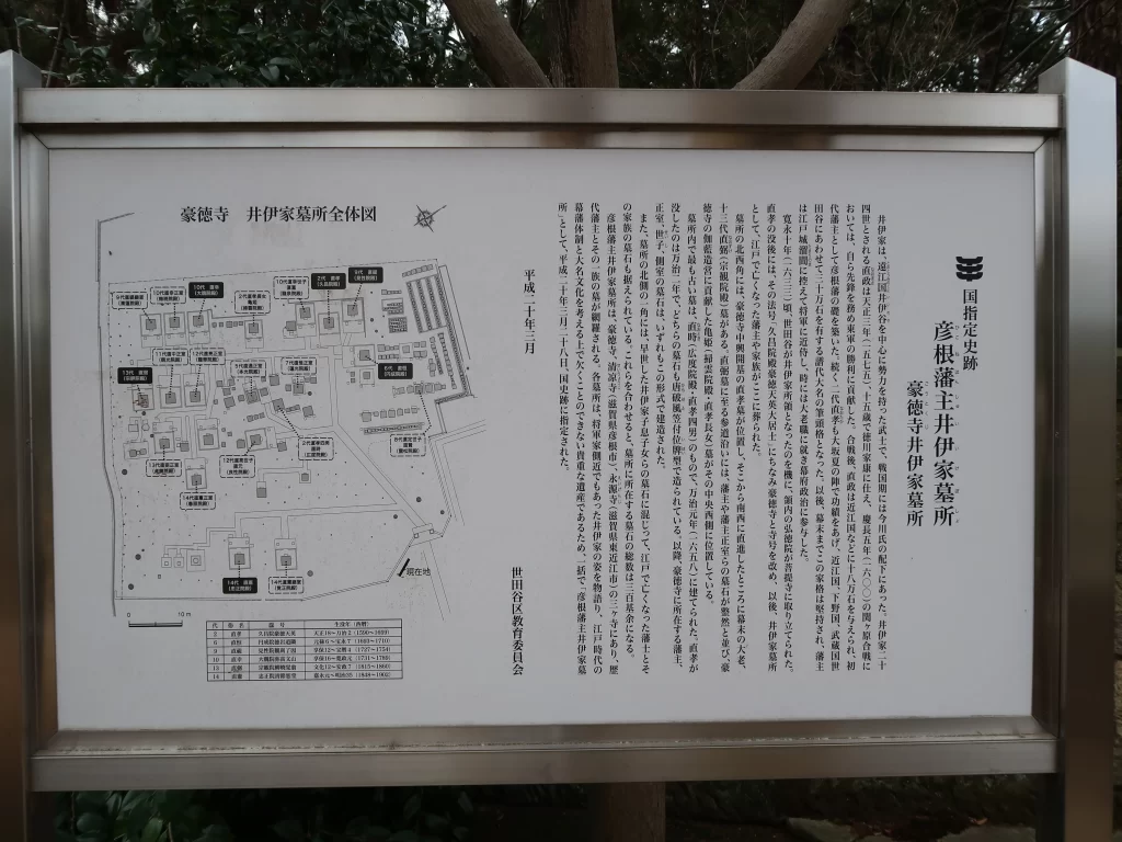 This site is the burial ground of the Ii family, which produced the Edo-period daimyo lord Ii Naosuke. The Ii family were hereditary vassals who served the Tokugawa shogunate for generations, with their main base being the Hikone domain. Their Kokudaka (the scale of their domain’s income) increased significantly due to their achievements at the Battle of Sekigahara, and they continued as a prominent family holding important positions within the shogunate throughout the Edo period.