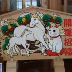 I find it quite interesting that the ema board inscribed with “Good Fortune and Happiness” features a Manekineko(beckoning cat). Ema are wooden boards with a horse design where people write their wishes to make a prayer. This year being the Year of the Horse, the ema uniquely depicts two horses: the horse of the zodiac and the horse drawn on the board itself. With the ema and the beckoning cat coinciding in this once-in-12-years Year of the Horse, I believe visitors this year are truly fortunate.