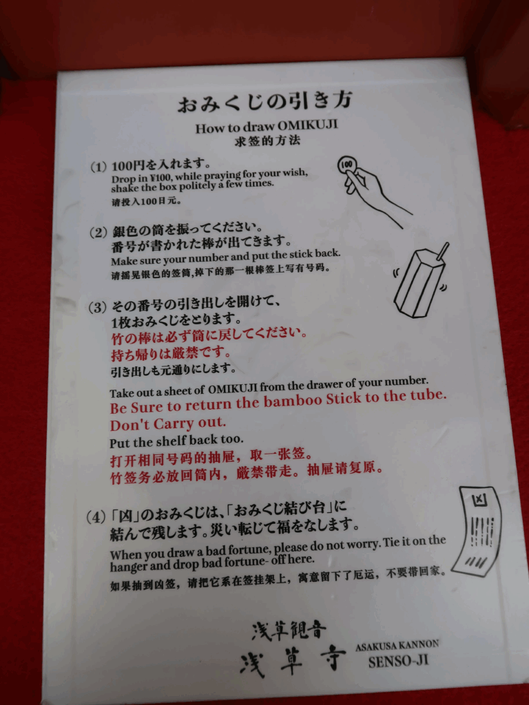 The omikuji will tell you your overall luck, from great blessing (大吉 / daikichi) to great curse (大凶 / daikyo).