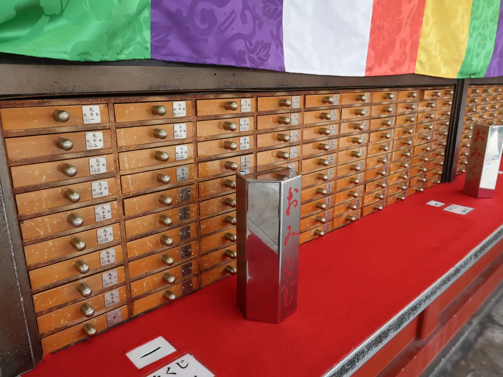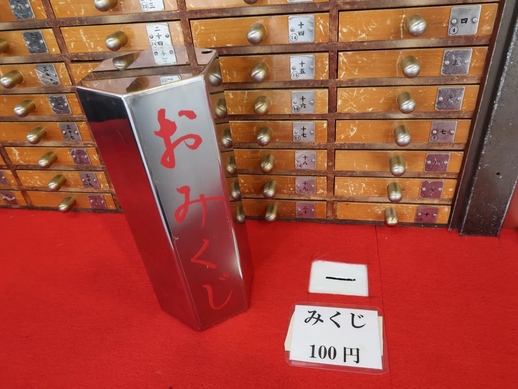 To receive an omikuji, you usually make a small offering and then draw a slip of paper from a box or shake a wooden container until a numbered stick comes out. Staff members will then give you the fortune slip that matches the number.