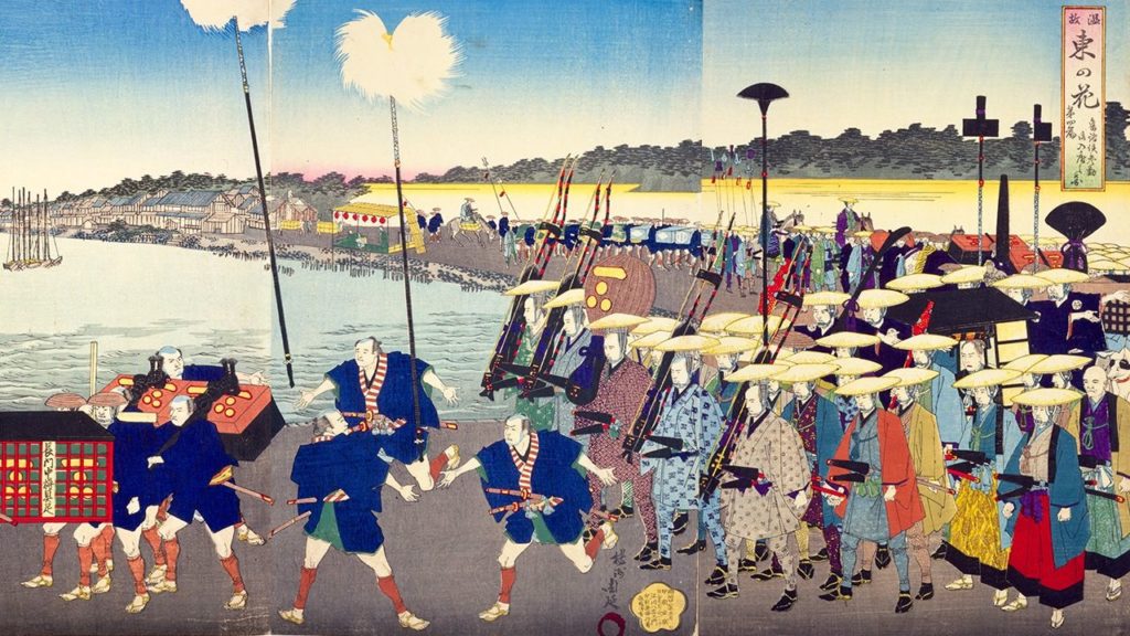 Sankin-kotai means “alternate attendance,” referring to a system where feudal lords had to live alternately between their domain and Edo.