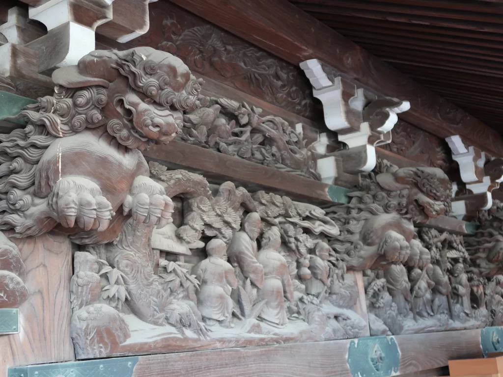 • Intricate wooden carvings illustrating Buddhist stories