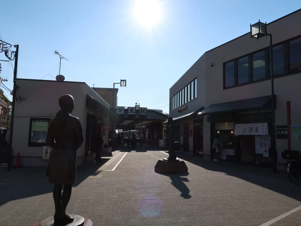 Outside the station stands a famous statue of Tora-san, the beloved character from Japan’s long-running film series Otoko wa Tsurai yo. Fans often stop here for photos before starting their walk.