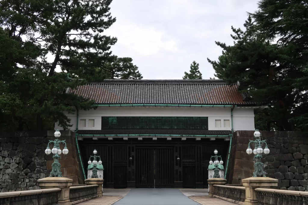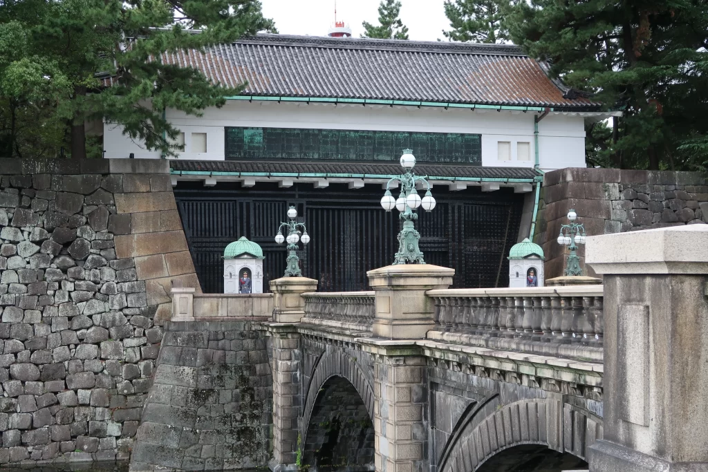 This gate is the main, formal entrance to the Imperial Palace grounds. It is used only when the Emperor leaves the Palace for important State occasions, for the official visits to the Palace by State guests, or when ambassadors present their credentials to the Emperor. Ambassadors are given the choice of arriving at the Palace in a horse-drawn carriage. The Main Gate to the Palace is open to the public on January 2nd and for the Emperor’s Birthday.Visitors to the Palace entering through the Main Gate cross two bridges, the Main Gate Stone Bridge and the Main Gate Iron Bridge. The Nijubashi Bridge refers to the Iron Bridge, not the two bridges. During the Edo period (1603-1867), because of its height above the moat, the Nijubashi Bridge was a wooden bridge reinforced underneath with a further wooden bridge, hence the name. The Palace buildings are hidden behind trees to the right of the Nijubashi Bridge.The most popular portrayal of the Imperial Palace is this view of the Stone Bridge with the Main Gate on the left, the Iron Double Bridge behind it, and the Fushimi watchtower in the distance.